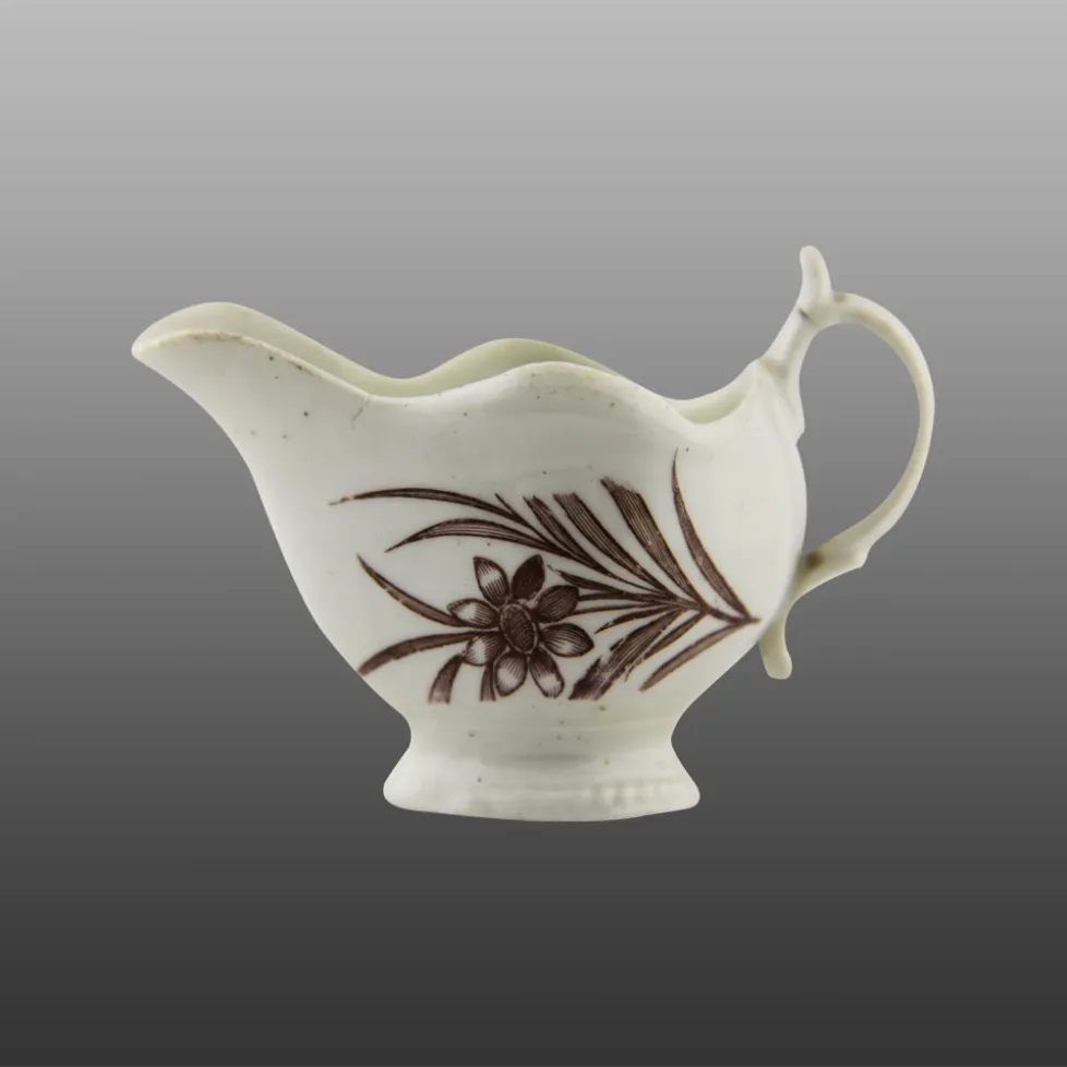 This is a very rare example of overglaze printing on Caughley porcelain.  Three different patterns were utilised but only four pieces so decorated are recorded.Some of the leaves in this print have been trimmed, so as to make the print fit the small surface available on the Chelsea cream ewer.  This was the contemporary name for this shape of cream ewer, which was popular at many