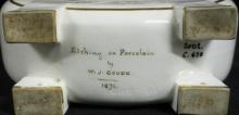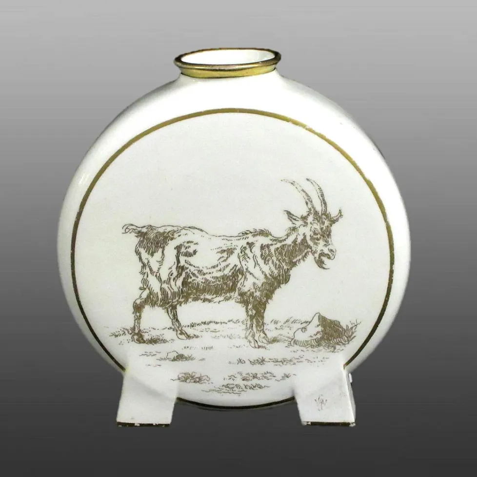 A flask raised on four square legs and printed in gold with a goat. The base of the flask is faintly impressed MINTON and across the base of the legs is painted in red 'Etching on porcelain by W.J.Goode Jan 4 1871'. This ornamental form is Minton's shape no. 1303 which is lightly impressed on the base.