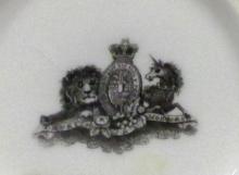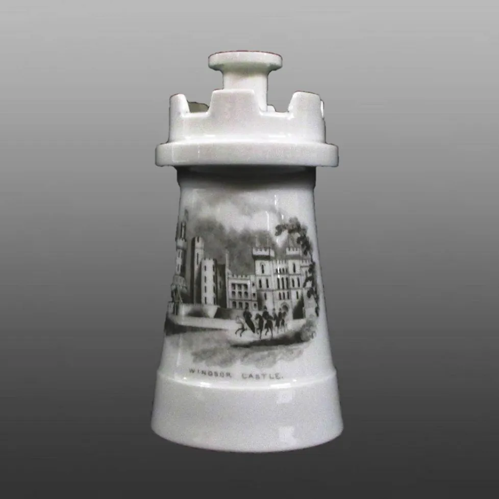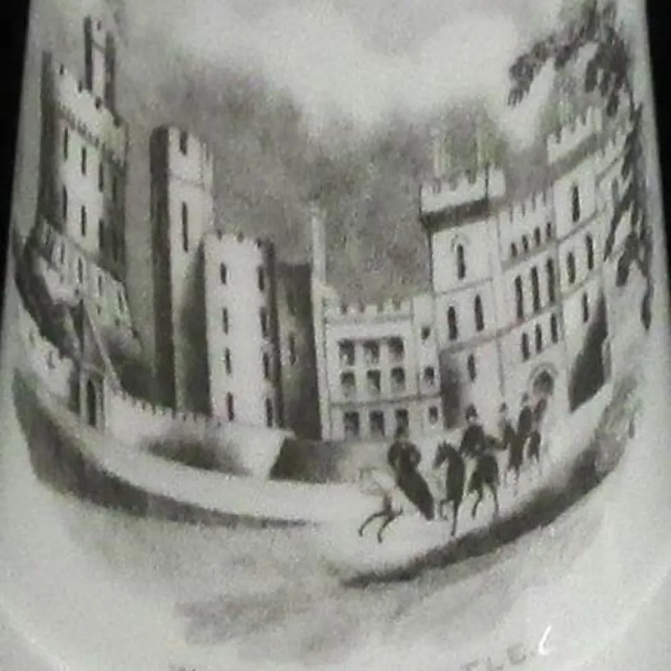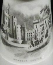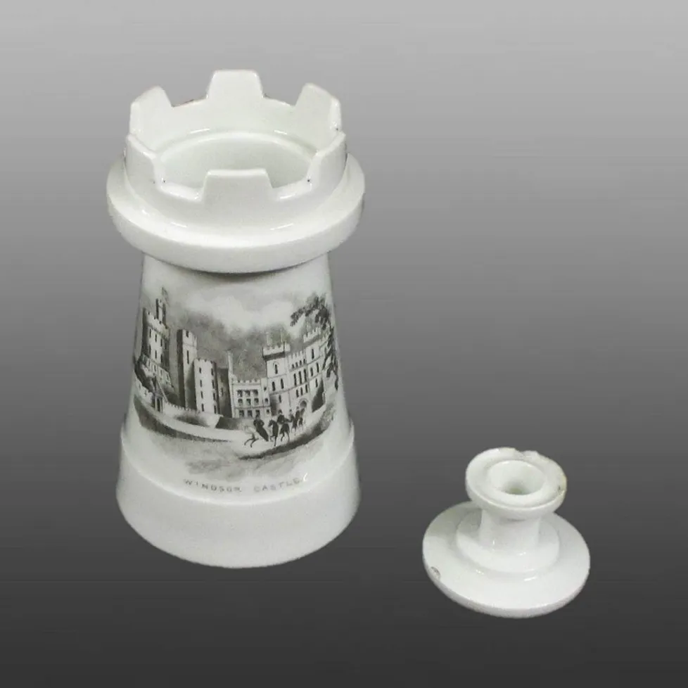 Bone china inkwell with removable top formed as a holder for a taper.  The front of the inkwell is printed with a scene entitled "WINDSOR CASTLE".  A group of horse riders enter the scene from the right; the leader is riding side saddle, suggesting that this is Queen Victoria and an escort riding outside her Windsor castle home.The mark on the base is the