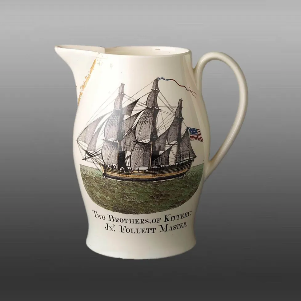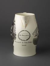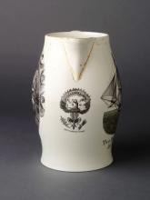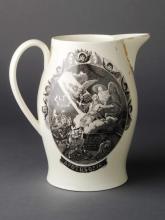 Perhaps the best known of the printed designs commemorating the death of Washington was that engraved by John James Barralet in 1800 and published by Simon Chaudron and Barralet in Philadelphia, and which was the source for the design on the reverse of this jug. In early February 1802 J. J. Barralet advertised his print “APOTHEOSIS OF WASHINGTON FINISHED FOR DELIVERY ….. The subject Gen. – Washington raised from the Tomb, by the Poetical and Historical Genius, assisted by Immortality – at his feet America weeping over his Armour, on the opposite side an Indian crouched in surly sorrow, in the third ground the Mental Virtues, Faith Hope and Charity. No doubt some examples of Barralet’s first edition traveled to England where enterprising manufacturers adapted the image for decoration of goods destined for the American market.