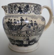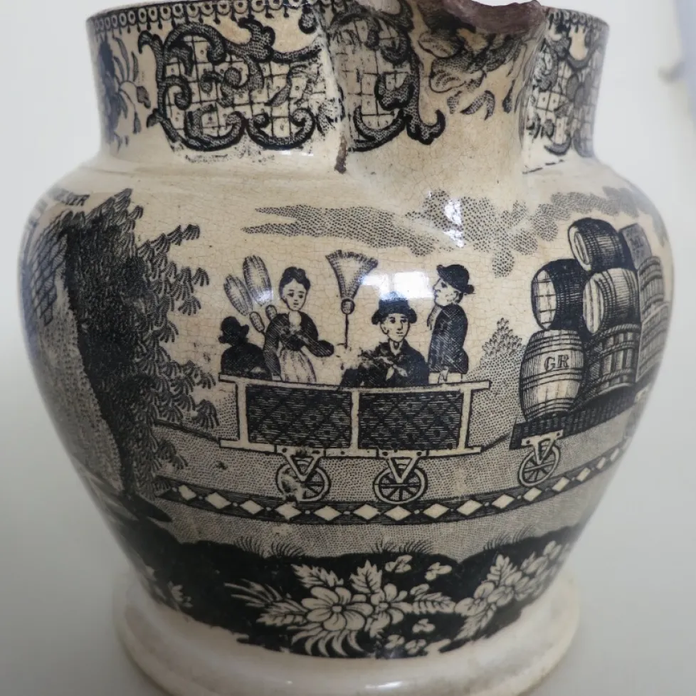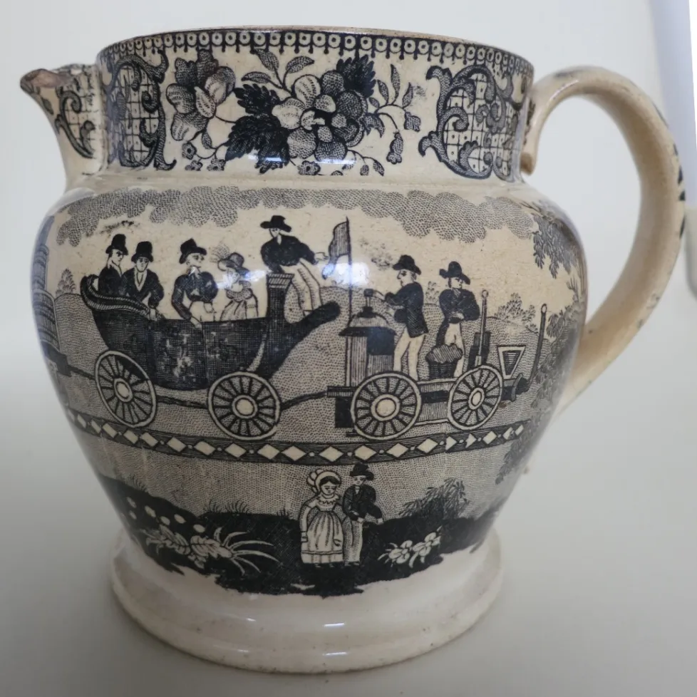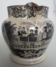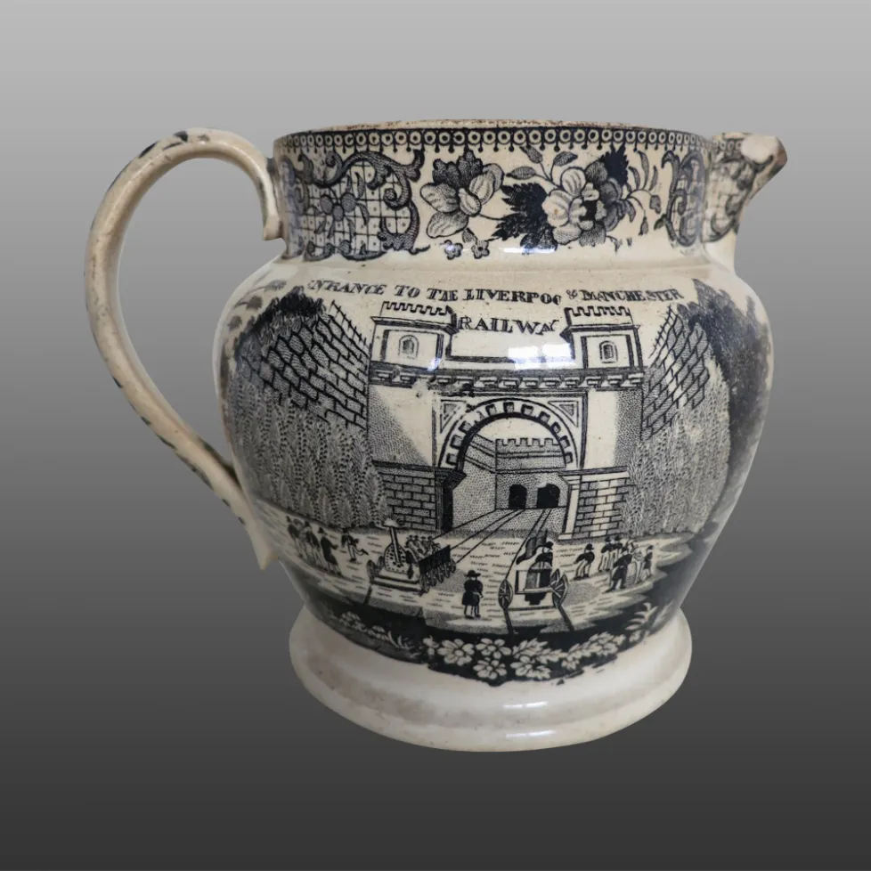 Earthenware jug printed with a view of the Entrance to the Liverpool and Manchester Railway, the first passenger railway in the world, which opened in 1830. The view shows the line entering the tunnel at Edge Hill as it approached the Liverpool terminus.BACK TO CATALOG INDEX