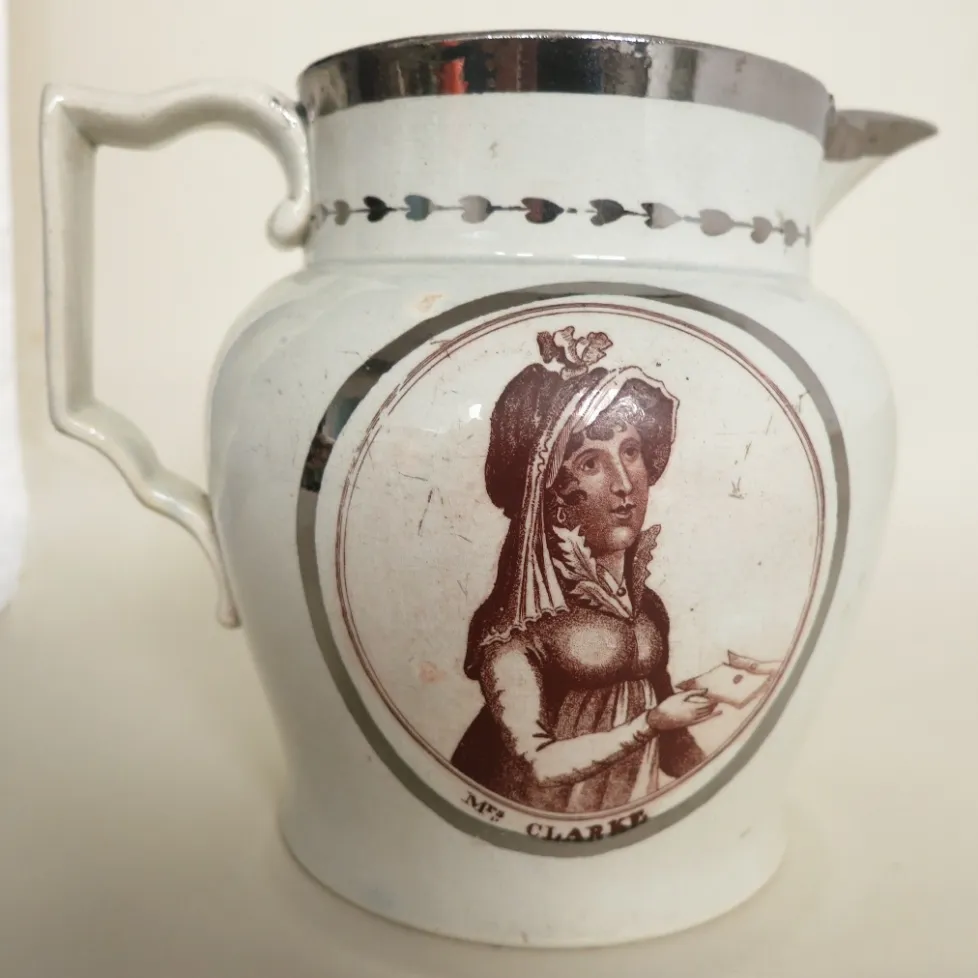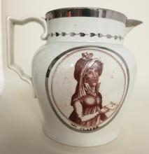 Pearlware jug printed in red with Frederick, Duke of York, and his mistress Mrs Mary Anne Clarke. Second son of George III and commander-in-chief of the army, the duke was accused of corruption in 1809 because it was alleged that Mrs Clarke was taking money from officers looking for promotion.BACK TO CATALOG INDEX
