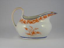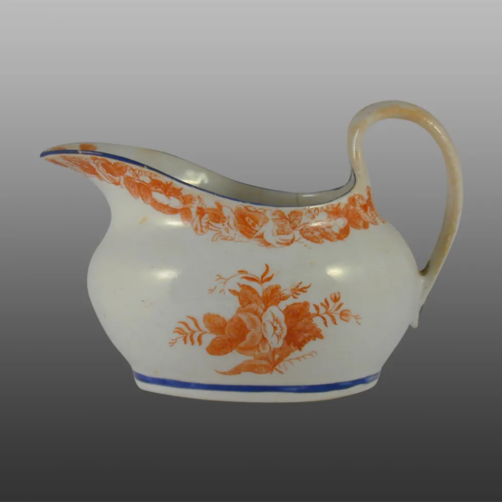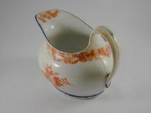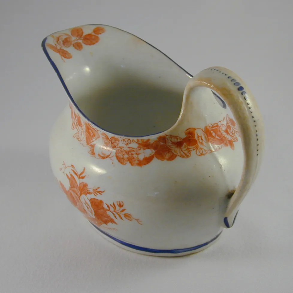 Oval hard-paste jug bat-printed in red, pattern 874, with sprays of columbine, blue enamel rim and base line.BACK TO CATALOG INDEX