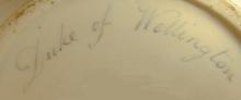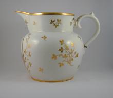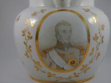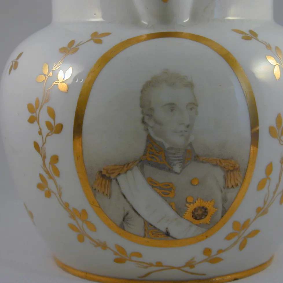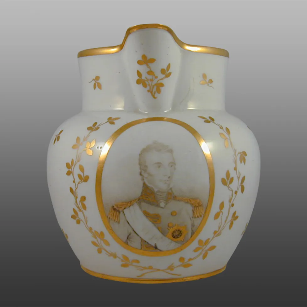 A large jug printed within a gold oval with a portrait of the Duke of Wellington enhanced with gilding, the rest of the body painted with gold leafy stems and sprigs. It is inscribed on the base in blue 'Duke of Wellington'. The title was conferred on him in 1814 and this jug was probably made to commemorate the occasion.BACK TO CATALOG INDEX