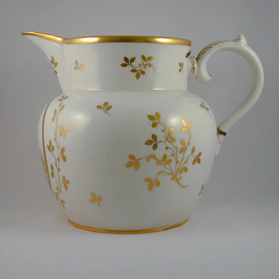 Side view of the jug showing handle form and gilding.