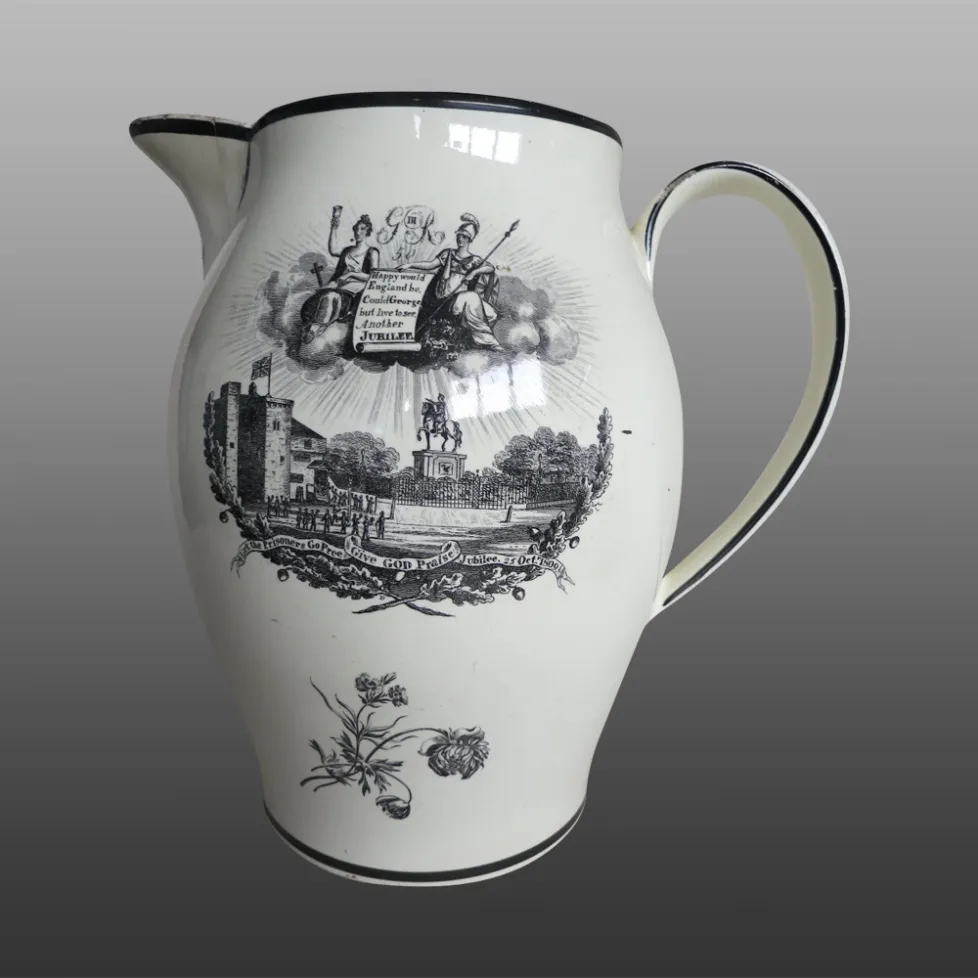 Under the lip is a printed cartouche enclosing the painted initials E&EJ and the date 1810. At the top is a copy of the Sun newspaper.