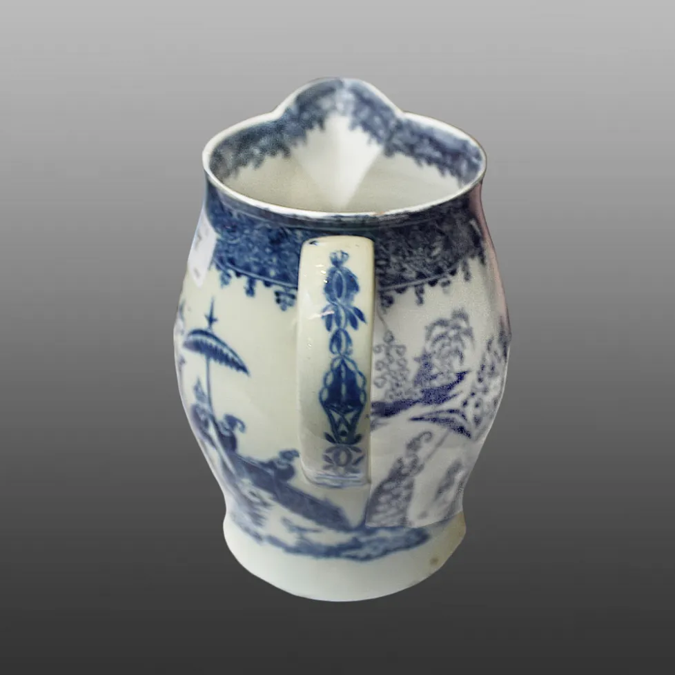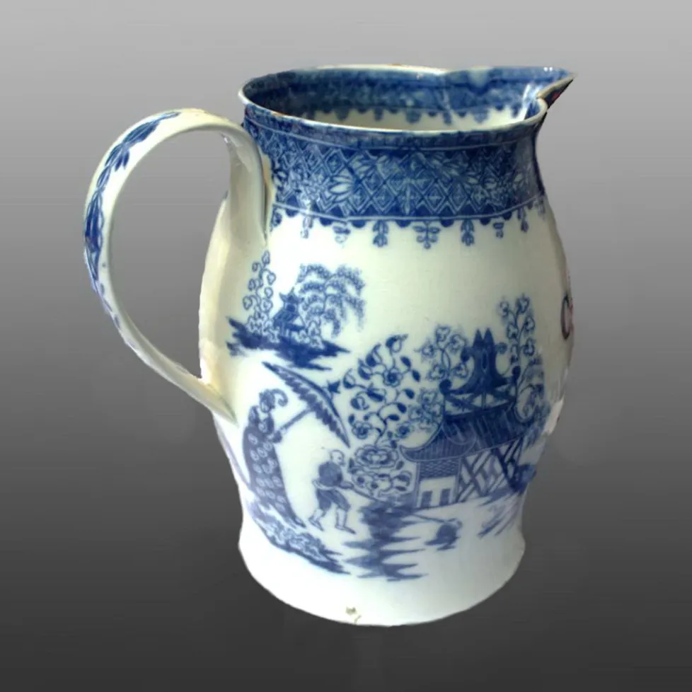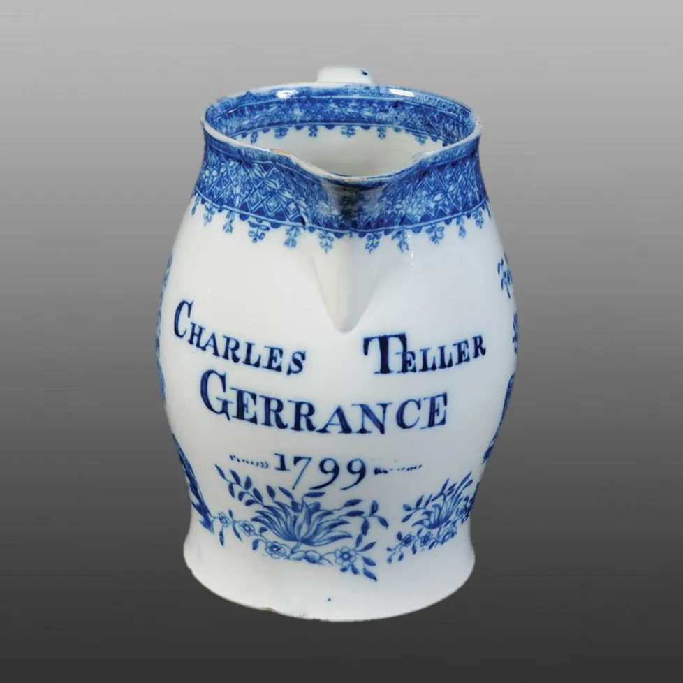A rare barrel shaped commemorative earthenware jug printed in blue with "CHARLES TELLER GERRANCE 1799" painted underglaze under the beak and with the well-documented Swansea Corn Husk border printed both inside and out. Printed on one side of the jug is the Fishing a Pond with Dip Net, and on the opposite side the Precarious Chinaman pattern is found. (See below.)BACK TO CATALOG INDEX