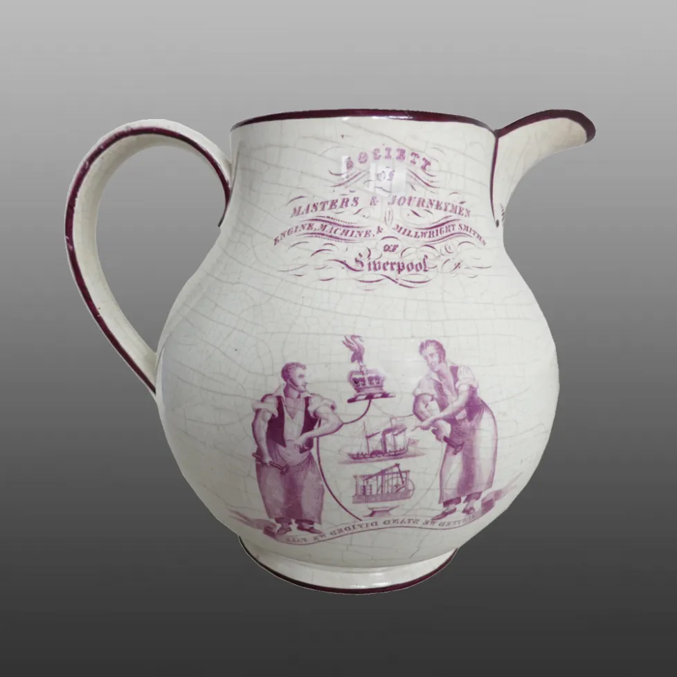 Earthenware jug printed with the fictive arms of 'The Society of Masters and Journeymen Engine, Machine and Millwright Smiths of Liverpool'. The main print is in reverse, note the motto below the shield is back to front. This may indicate that an engraving made for a book or for printing on paper has been used.BACK TO CATALOG INDEX