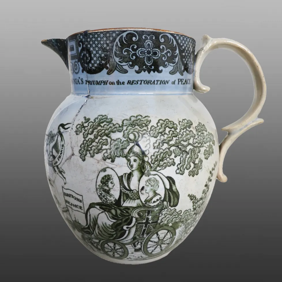 Earthenware jug printed underglaze in brownish black with "Britannia's Triumph at the Restoration of Peace". She carries medallions labelled "George III" and "'Bonaparte" and commemorates the Peace of Amiens in March 1802, a one-year interval in the Napoleonic Wars.Underglaze black and brown were evidently generally available for printing by this date.BACK TO CATALOG INDEX