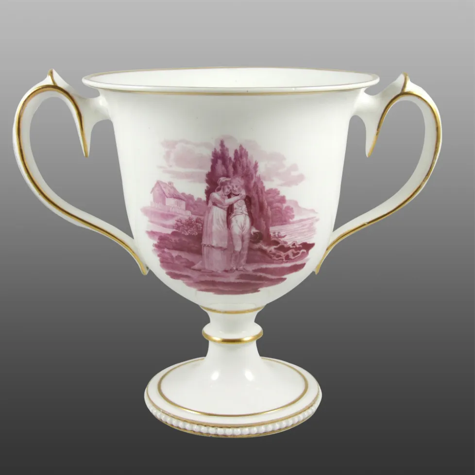 A beaded loving cup bat printed in purple with a different genre scene on each side, print numbers P.353 and P.359 from the Classical and Contemporary Humanity Series.  The pattern number is unknown.  The item is unmarked but attributed to Spode.  Print reference Drakard, David and Holdway, Paul. Spode Transfer Printed Ware, 1784-1833. Woodbridge, Suffolk, Antique Collector's Club, Inc., 2002.