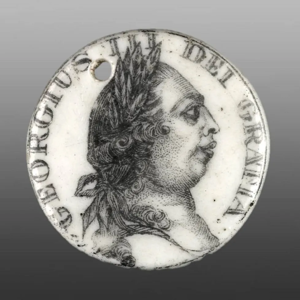 The other side of the medallion is printed in black enamel with a crown, surrounded by an inscription: WORCESTER PORCELAIN MANUFACTORY Visited by their MAJESTIES August 9 1788.Shape Type