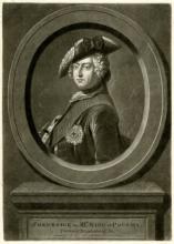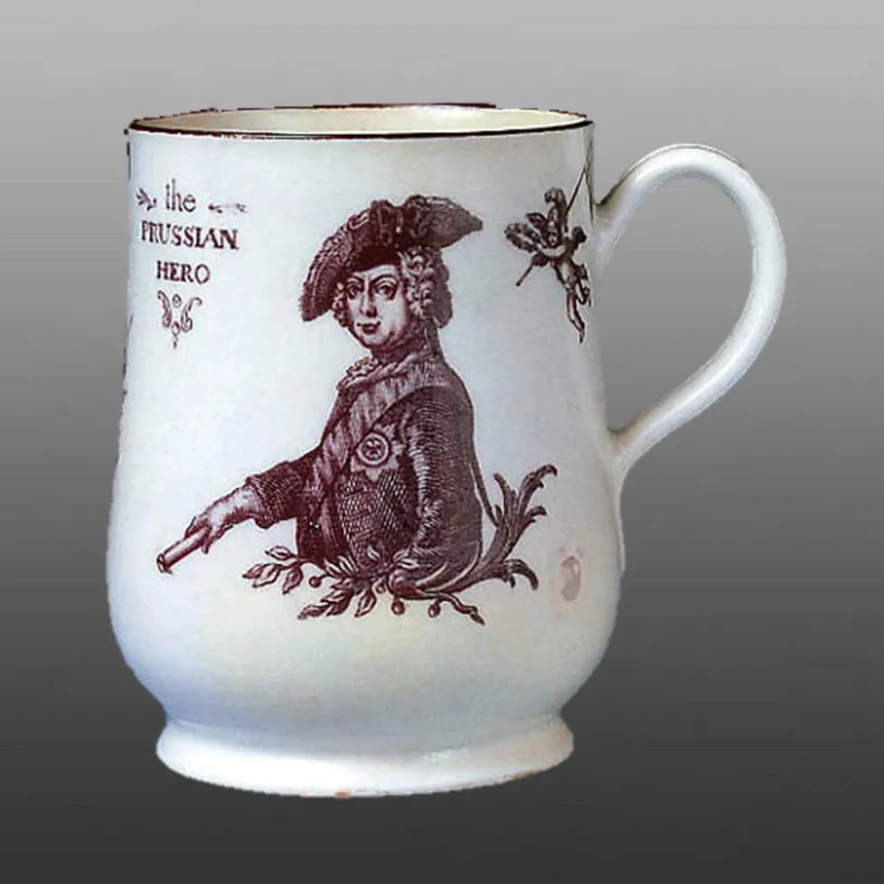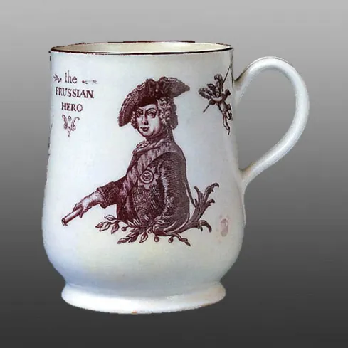 The likely source of the King of Prussia print on this Bow mug is this engraving by R Houston after the painting by Pesne and printed for John Bowles.Additional Image: