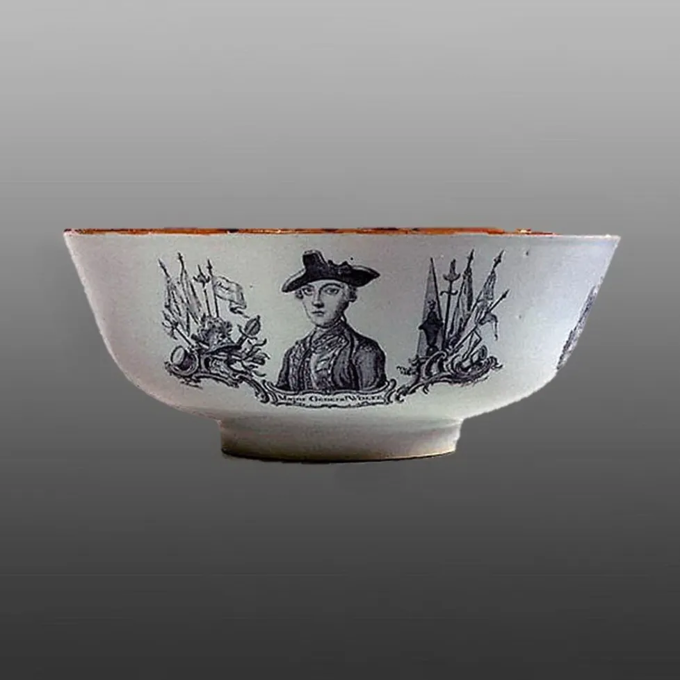 The print of Wolfe is rare.  Here it is seen on a Liverpool tin glaze punch bowl.