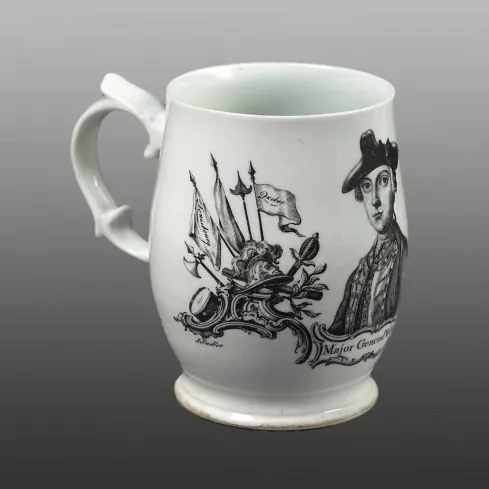 This Longton Hall porcelain mug is decorated with a print entitled "Major General Wolfe", with rococo scrollwork to either side, surmounted by trophies of arms, funeral monuments and flags. Two flags on the left are inscribed with the names "Louisbourg" and "Quebec", two of Wolfe's victories in North America during the Seven Years War.  He was fatally wounded at the latter battle in 1759.  The printing was carried