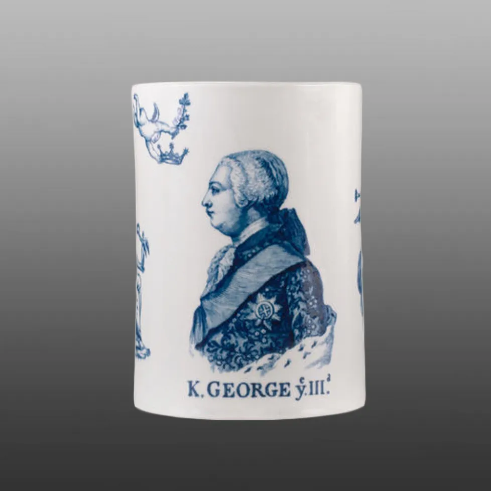 This Worcester mug bears a print of George III between subsidiary prints of Britannia and Fame. Above the king's head is a cherub bearing a crown. Overglaze prints of the King and Queen were produced for their coronation in 1760. Later the copper plates were adapted for printing in underglaze blue by some fine detail being polished out and the main outlines being more deeply cut. Printed titles were also added below the portraits.