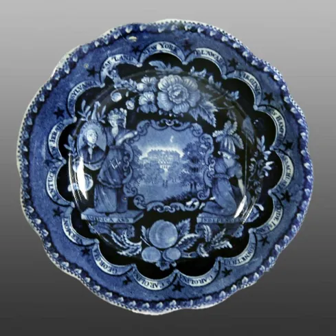 This plate is perhaps a dessert or bread plate. The more common name used for this series is America and Independence, due to those words appearing on the plate. Arman's numbering system made this #10 in the seriesThe central pattern on this example is taken from the source print shown below.   Prior to discovery of the source prints that Clews used for these patterns, researchers