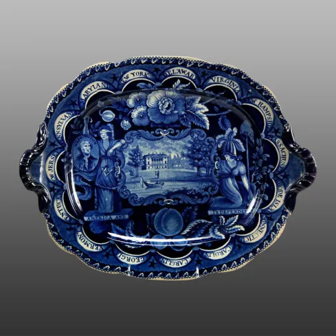 A large earthenware under tray, presumably to a soup tureen. This is No. 12 in the Arman's numbering system and the view appears on this tray, as well as on several sizes of platters, a vegetable dish, a pitcher and two sizes of bowls, including a large wash bowl.The central pattern on this example is taken from the source print shown below.   Prior to