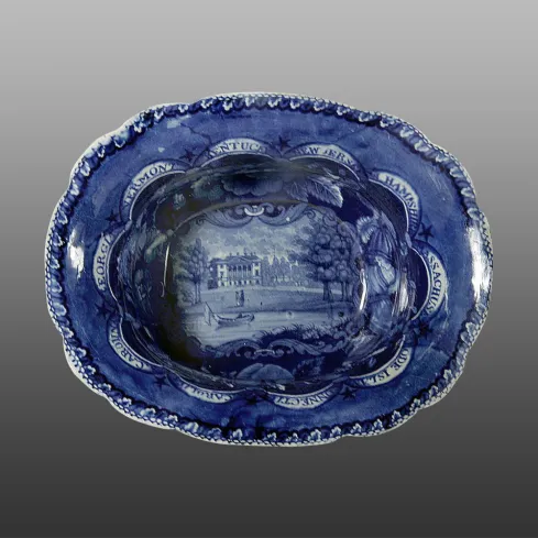 In spite of being fairly large, this 14 inch earthenware vegetable dish only had room inside for 10 of the 15 states' names.  This is true of smaller examples in this series where as few as five of the names are printed. This is No. 12 in the Arman's numbering system and the view that appears on this dish is also found on several