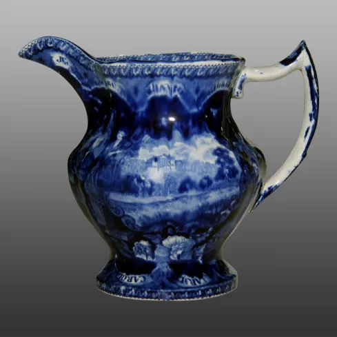This small pitcher, likely a cream or syrup pitcher, is No. 13 in the Arman's numbering system. The central pattern on this example is taken from the source print shown below. Portions of the border pattern are quite blurred on this example.  Prior to discovery of the source prints that Clews used for these patterns, researchers David and Linda Arman endeavored to provide descriptive names