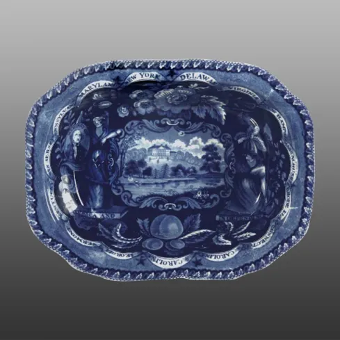 This earthenware vegetable dish has what is referred to as a combed back,consisting of ridges on the underside of the piece. The more common name used for this series is America and Independence, due to those words appearing on the plate. David and Linda Arman numbered the views in this series from 2 to 15 (the number 1 pertaining to another series) and this view is No.13.The central pattern on this example is taken from the source print shown below. Prior to discovery of the source prints that Clews used for these patterns, researchers David and Linda Arman endeavored to provide descriptive names for them. The Armans named this scene Building, Two Wings, Water in Foreground