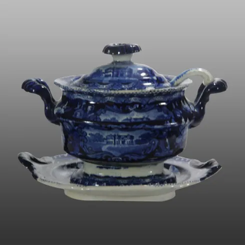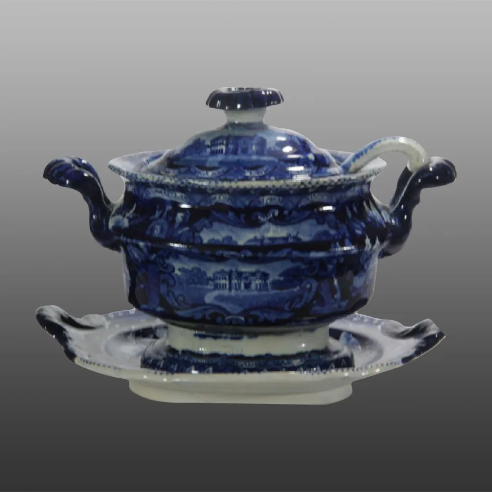 This earthenware sauce tureen shows view No. 14 in David and Linda Arman's numbering system.  It sits on an under tray. The view printed on the tray is not known.The central pattern on this example is taken from the source print shown below.   Prior to discovery of the source prints that Clews used for these patterns, researchers David and Linda Arman endeavored to provide