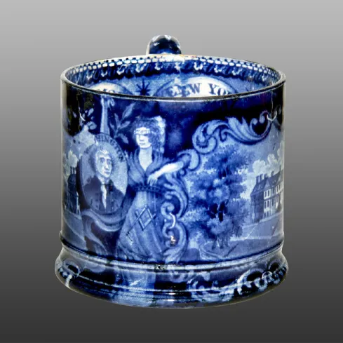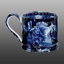 This earthenware mug shows No. 15, the last in the series numbered by David and Linda Arman.  Below is a different perspective of the mug since part of the scene is covered by the image of Washington.  Because of the small size, only 7 of the states' names are included in the border on the inside of the mug. The central pattern on this