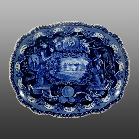 This earthenware vegetable dish, No. 15 in accordance with David and Linda Arman's numbering system, is large enough to show all 15 of the named states on its inside rim.  The central pattern on this example is taken from the source print shown below.   Prior to discovery of the source prints that Clews used for these patterns, researchers David and Linda Arman endeavored to
