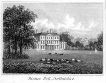 Title: Bishton Hall, Staffordshire Artist: Unknown Engraver / Plate  Maker: UnknownThis print appears in Marshall's Select Views in Great Britain.  Bishton Hall is a Georgian Mansion, set amongst 25 acres of gardens in the heart of rural Staffordshire. Bishton is first mentioned in the Domesday book, a survey of the