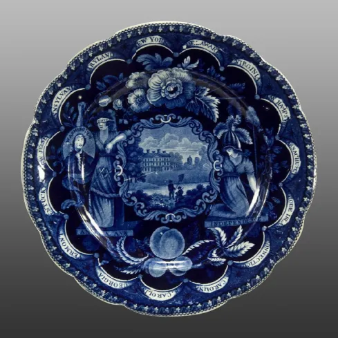 The view printed on this large earthenware dinner plate only appears on a plate and similarly sized soup bowl. The more common name used for this series is America and Independence, due to those words appearing on the plate. This is No. 3 in Arman's numbering system.The central pattern on this example is taken from the source print shown below.   Prior to discovery of the