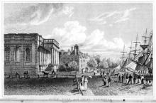 Title: Town Hall and Quay, Yarmouth Artist: Neale, John Preston Engraver / Plate Maker: Lacey, Samuel Size: 4 by 2.5 Print Date: 1825This print also appears in Marshall's Select Views in Great Britain.