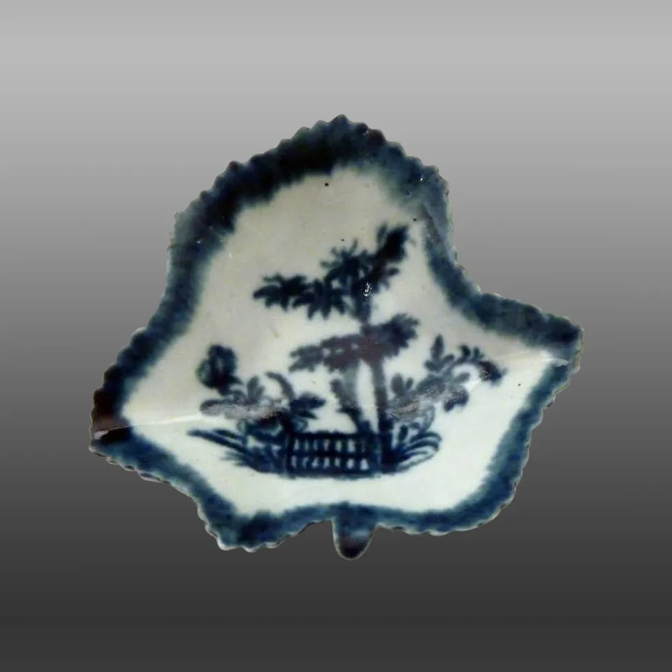 This pickle dish is decorated with a very rare print dating from the very early period of underglaze blue printing at Worcester. The print is not recorded in Braynan, French and Sandon's book on blue and white Worcester but an unglazed shard showing the print was excavated on the Worcester site. This shard is shown in the Watney sale catalog at lot 194 along with a matching pickle dish. Like the present example the printing on the Watney pickle dish is slightly blurred, perhaps indicting technical problems. The catalog entry identifies the print as the Bamboo Billboards. However, there are a number of differences between that pattern and the one on this leaf dish and the one in the Watney sale. This pattern therefore needs a separate name.