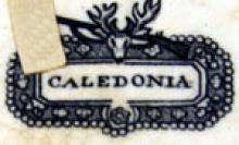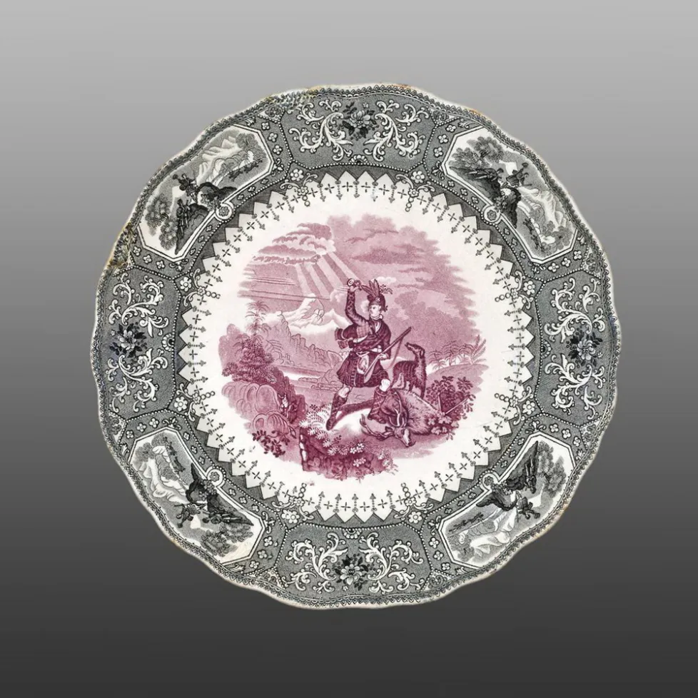 An earthenware plate printed in black and purple in a pattern named CALEDONIA.  The pattern name is printed on the back along with an impressed ADAMS mark.  The plate features one of the many scenes from the William Adams and Sons Caledonia Series. "Caledonia" was the Roman name for northern Britain and was also a name used in poetry to describe the Scottish Highlands.