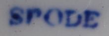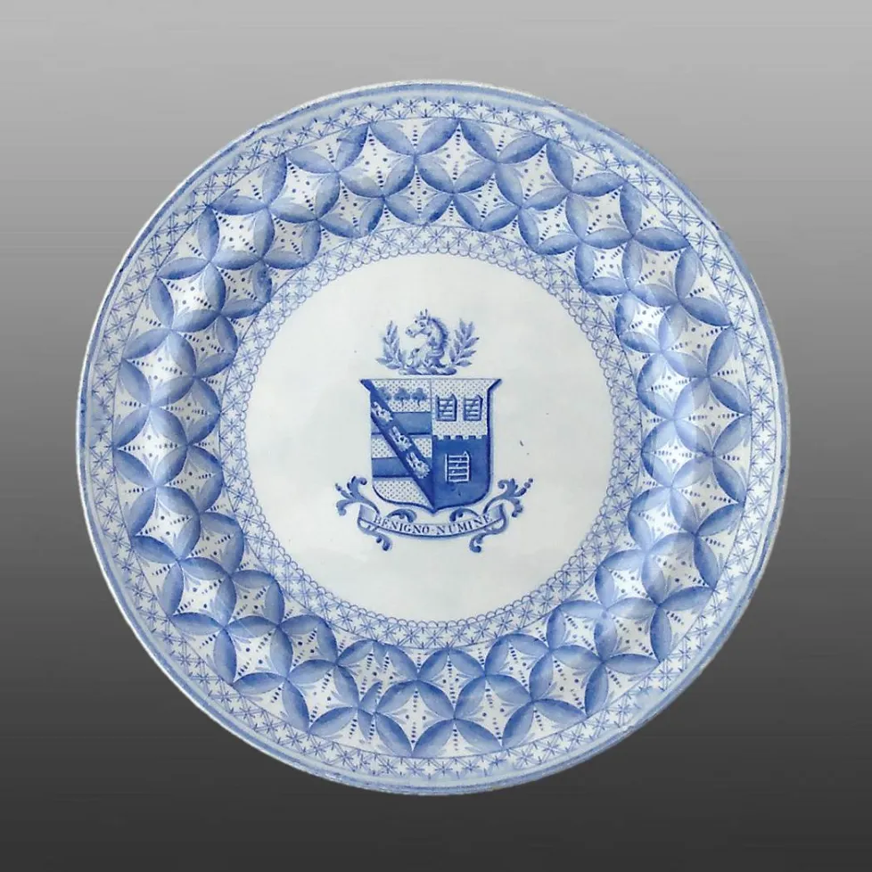 A round earthenware plate printed in medium blue with the Geranium Border and, in the center, the impaled Copeland-Yates Arms. William Taylor Copeland is named against the entry in the Arms Book. Provenance: A. Gresham Copeland and Robert Copeland collections.BACK TO CATALOG INDEX
