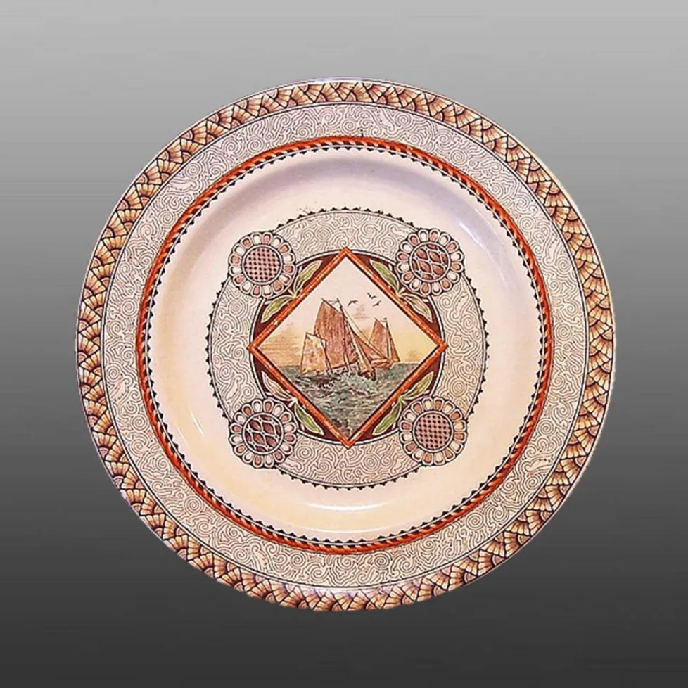 An earthenware plate printed in multiple colors with a waterscape pattern, one of several different center patterns all produced with the name Wisconsin. The Brownfield & Sons ad in the Pottery Gazette 1884 featured the Wisconsin pattern on a plain jug shape. One-color and multicolor versions--some with painted colors added--of this design were produced. A printed and painted version on a cup and saucer