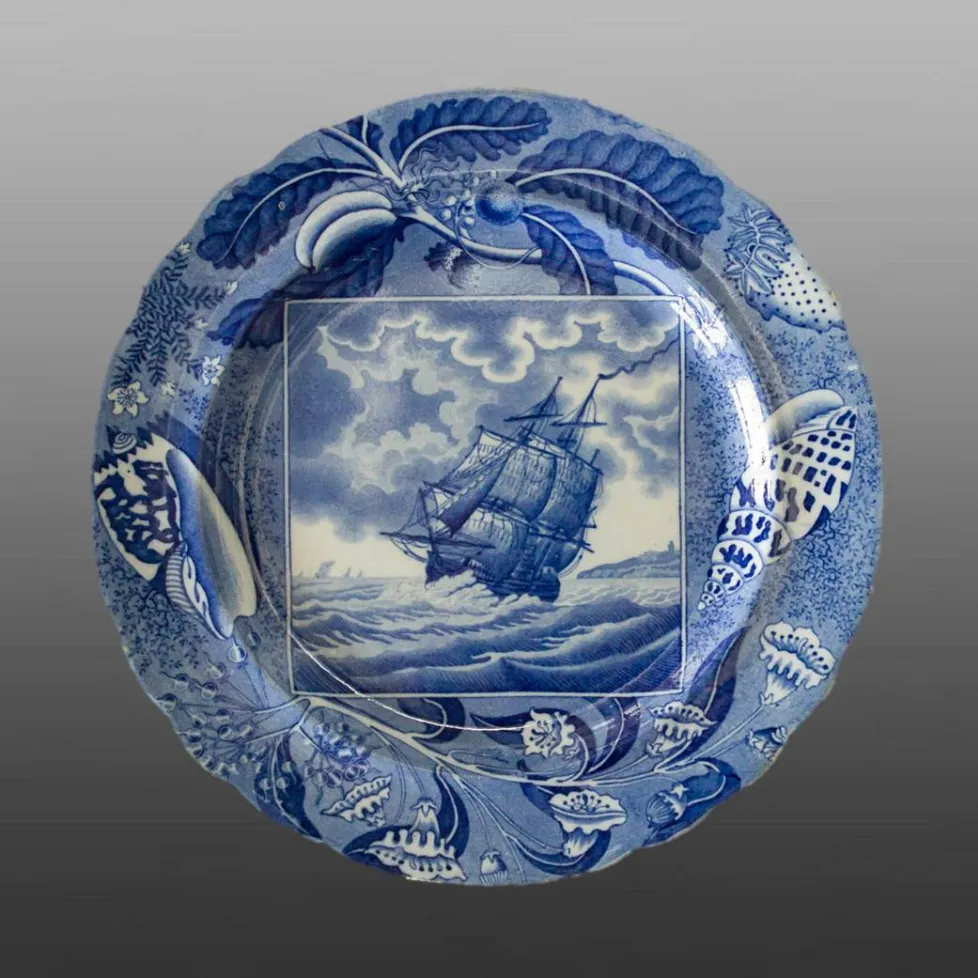 An earthenware plate printed in blue with a pattern named Frigate I. Frigates scouted for the fleet, went on commerce-raiding missions and patrols, conveyed messages and dignitaries, and filled in places in the line of battle if there was a shortage of battleships.
