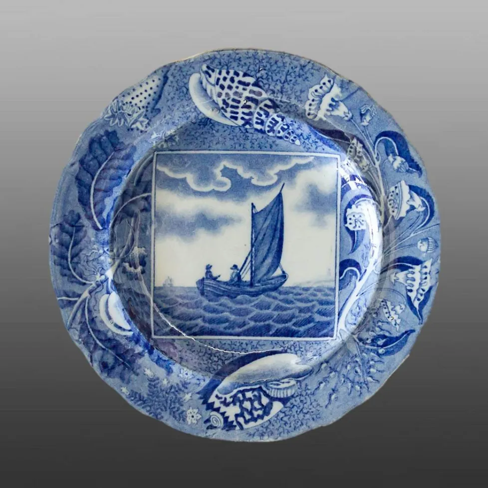 An earthenware plate printed in blue with a pattern named Fishing Dinghy.BACK TO CATALOG INDEX