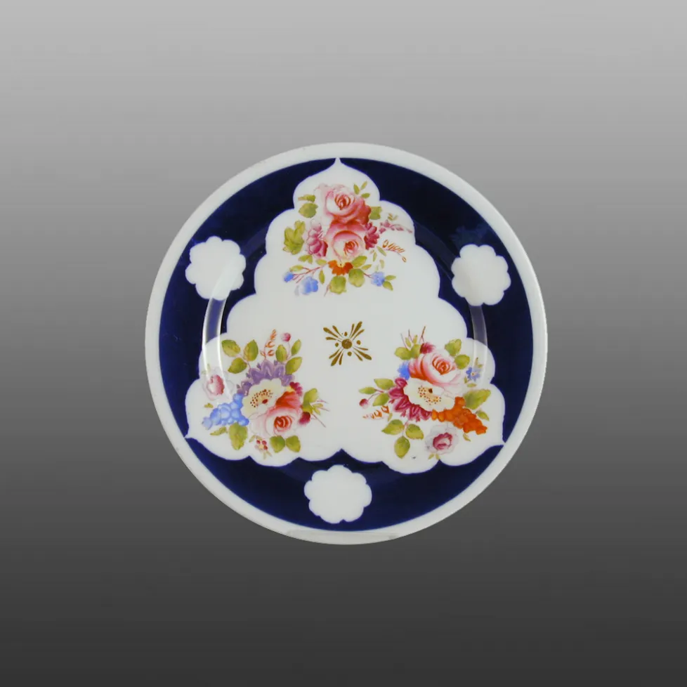 A tea plate outline printed and coloured with floral groups within a shaped reserve out of an under-glaze blue ground. This is an unfinished pattern and probably the blue ground would have been gilded and flower-heads painted in the circular reserves.BACK TO CATALOG INDEX