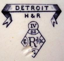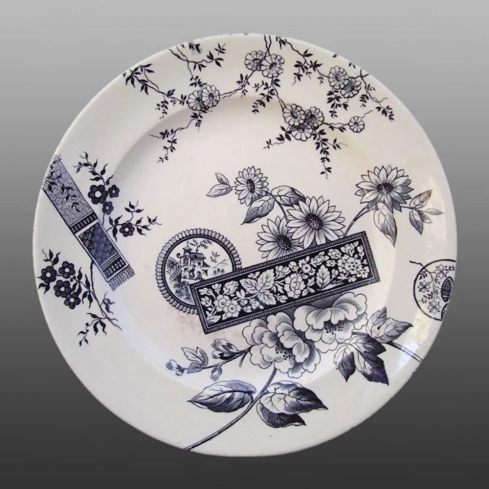 A large round earthenware plate printed in black with the Detroit pattern. This pattern was registered on February 22nd 1883, by Hall & Read of Hanley. A small cartouche of a chinoiserie design is included within the floral design.BACK TO CATALOG INDEX