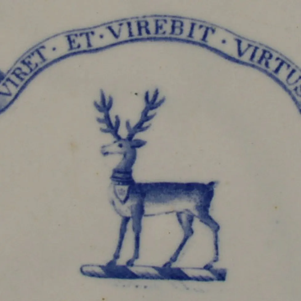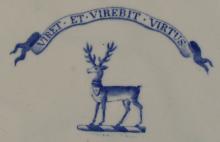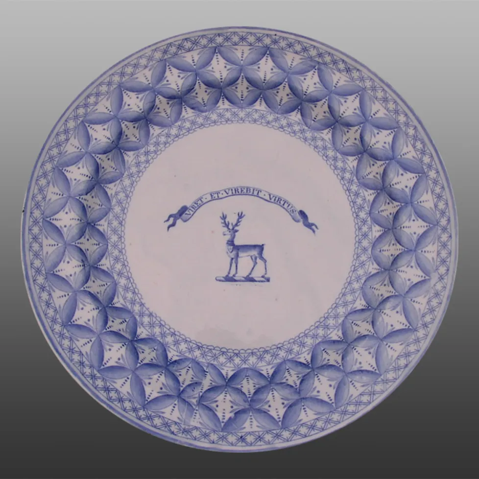 A round armorial earthenware dinner plate printed in blue with the coat of arms of Thomas Greene surrounded by the border generally seen on Spode's Geranium pattern.BACK TO CATALOG INDEX