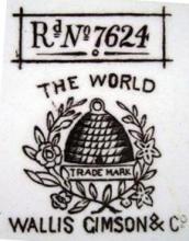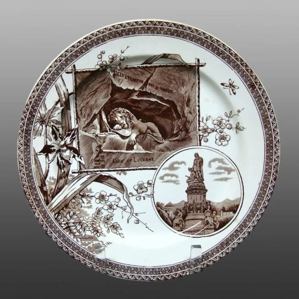 An aesthetic movement earthenware plate printed in dark brown. The border design features a double row of geometric shapes along the rim and, in the center, wildflowers and blooming Orchids surrounding two cartouches; one of the Monument of Columbus in Spain and the other, the Lion of Lucerne.The Lion Monument in Lucerne is a giant dying lion carved out of a wall of sandstone
