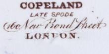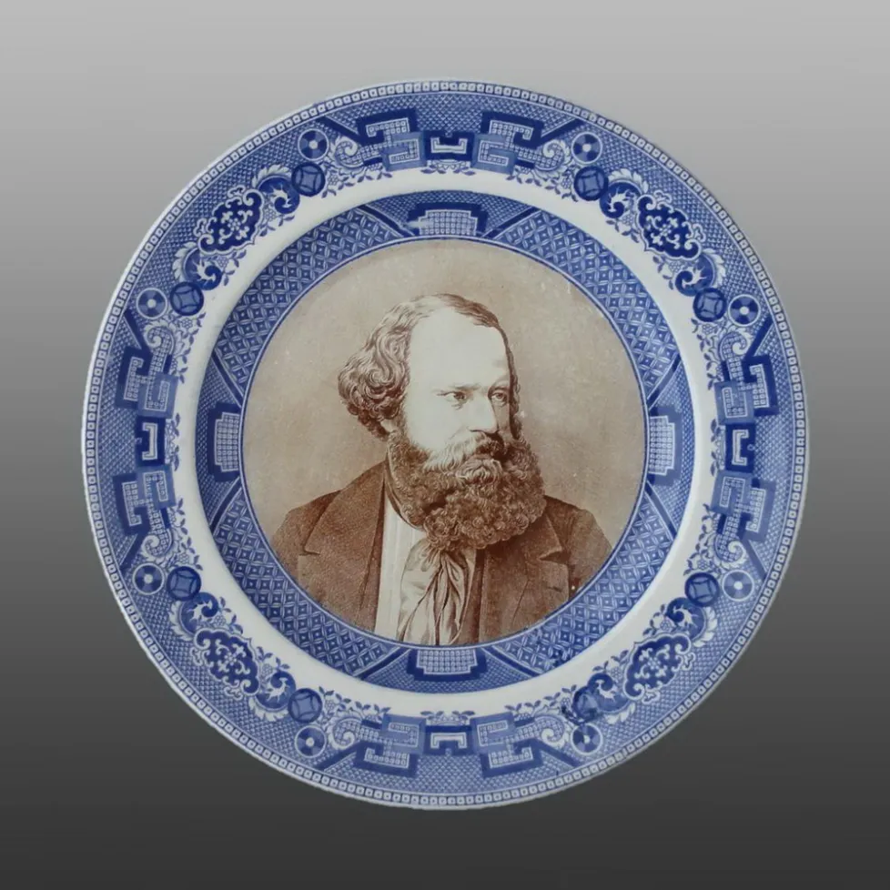 A circular earthenware advertising plate.  The border is printed with the border used for the Standard Willow pattern. A portrait of Albert Smith is printed underglaze in brown in the center.  Robert Copeland noted that the rare mark printed in brown on the back occurs on a white earthenware plate depicting a portrait of Albert Smith who offered entertainments in The Egyptian Hall, Picadilly,