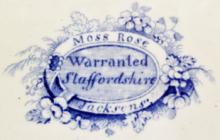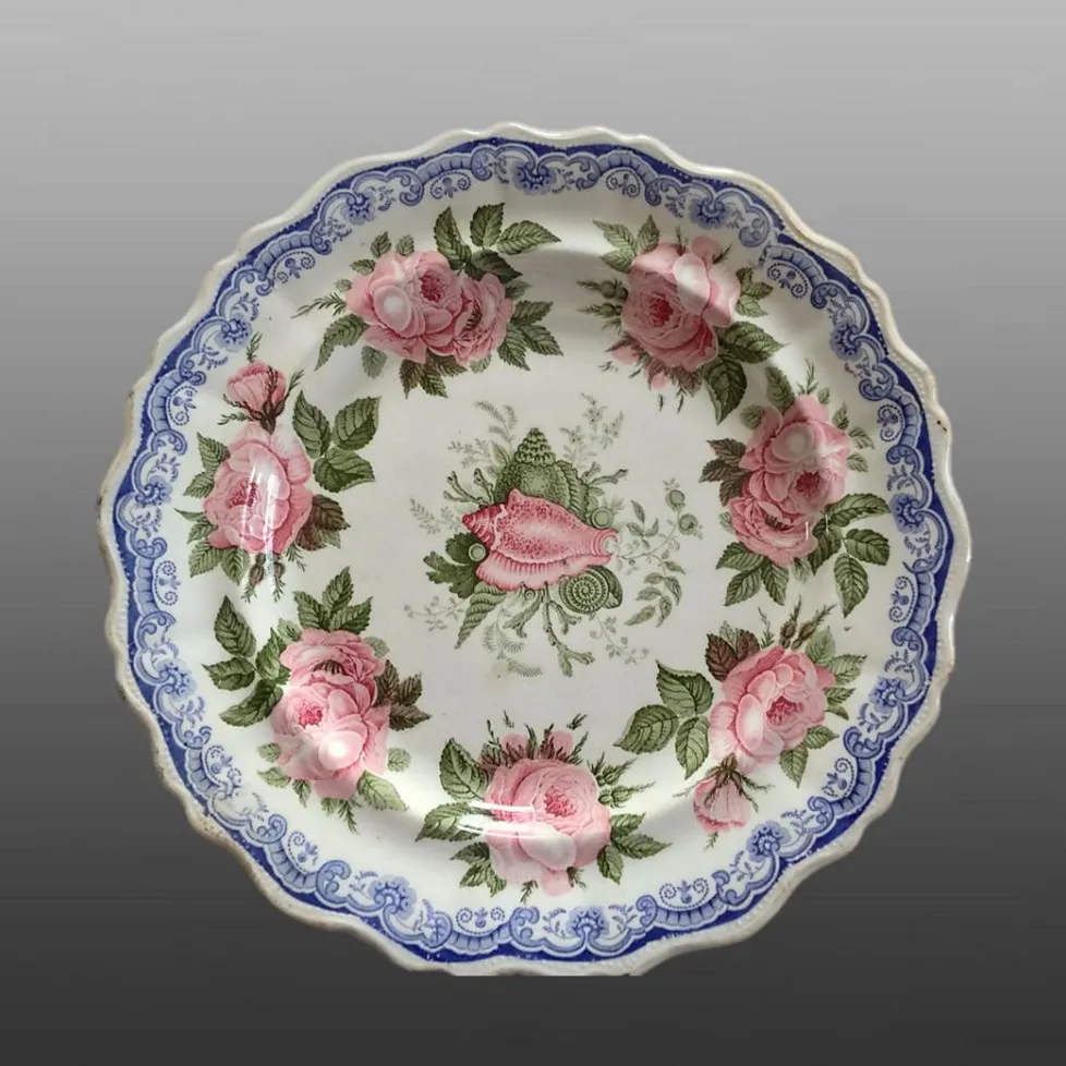 An earthenware molded plate, size unknown, printed in three colors; blue, green and pink with a pattern named Moss Rose. While the pattern is named for the wreath of roses that is the dominant feature of the design, the roses actually serve as the design's inner border framing a small group of seashells in the center.BACK TO CATALOG INDEX