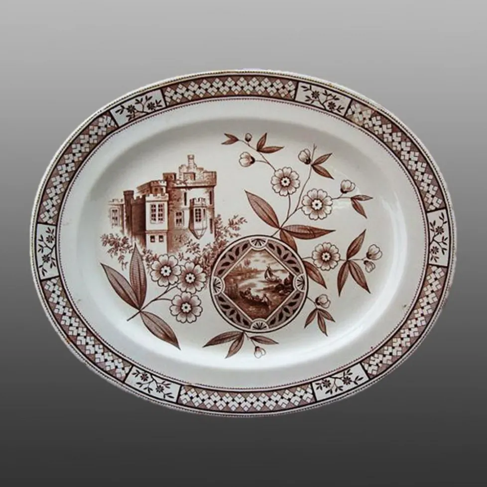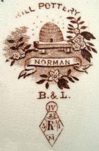 An oval earthenware platter printed in dark brown in the Aesthetic style. The maker's mark indicates the pattern was named Norman, and that it was made at Burgess & Leigh's Hill Pottery factory. Reference the mark shown above, the registration date for this pattern is June 23, 1872.BACK TO CATALOG INDEX
