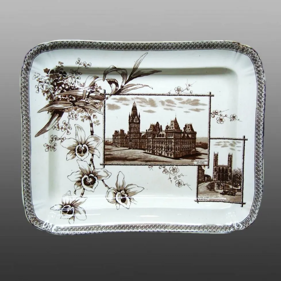 An aesthetic movement earthenware platter printed in dark brown. The pattern features exotic blooming orchids and wildflowers mixed with fern fronds and includes two cartouches; one of the Parliament Buildings in Ottawa and another with Notre Dame in Montreal.Notre-Dame Basilica is a basilica in the historic district of Montreal Canada.  The church's Gothic revival architecture is among the most dramatic in the world; its