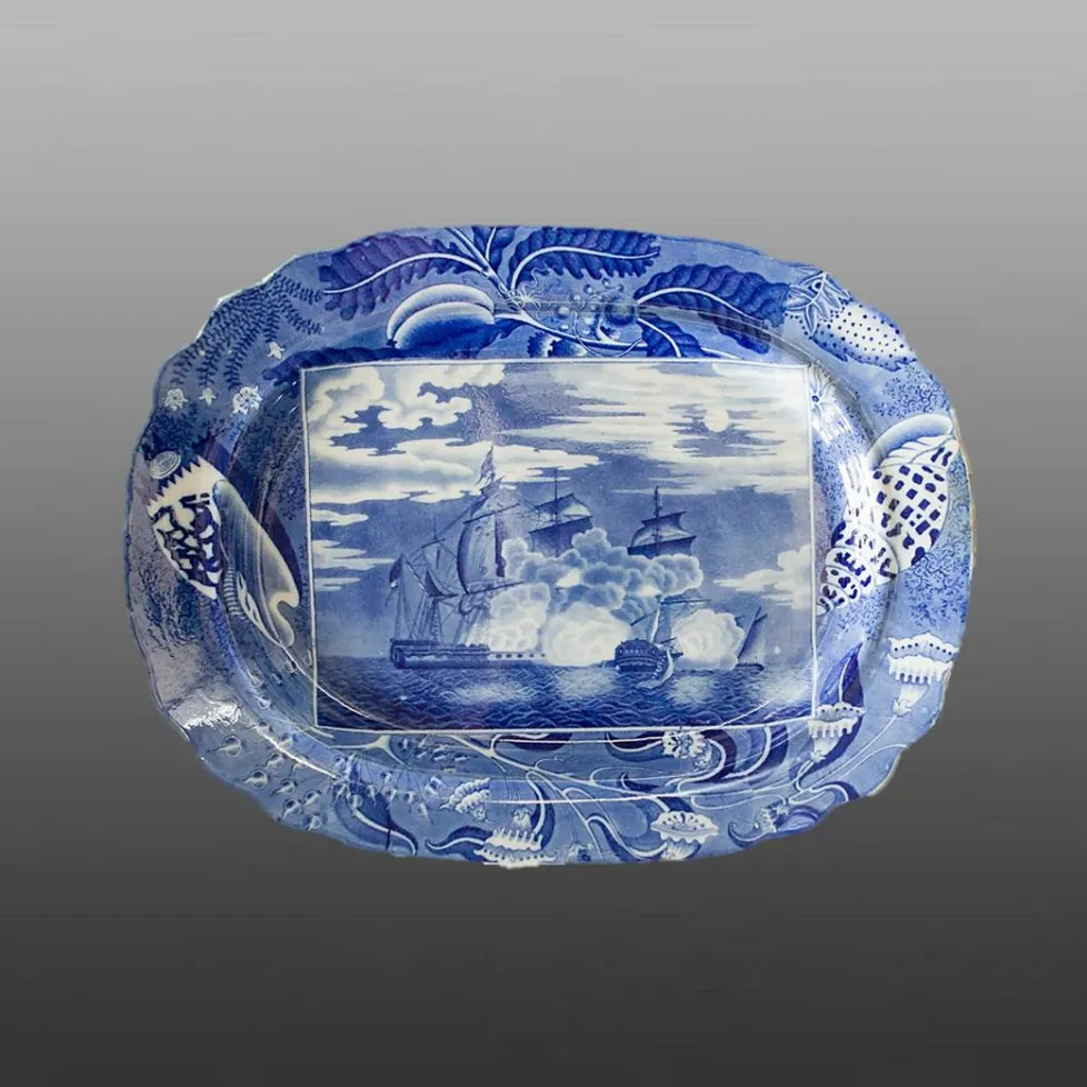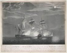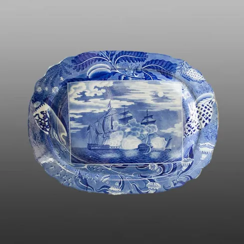 A large indented earthenware platter printed in blue with a naval scene named Night Sea Battle. The scene is based on a print of the moonlight battle between the Blanche and La Pique which took place on January 4, 1795 (see below). For other examples in the Shipping Series click here.BACK TO CATALOG INDEX