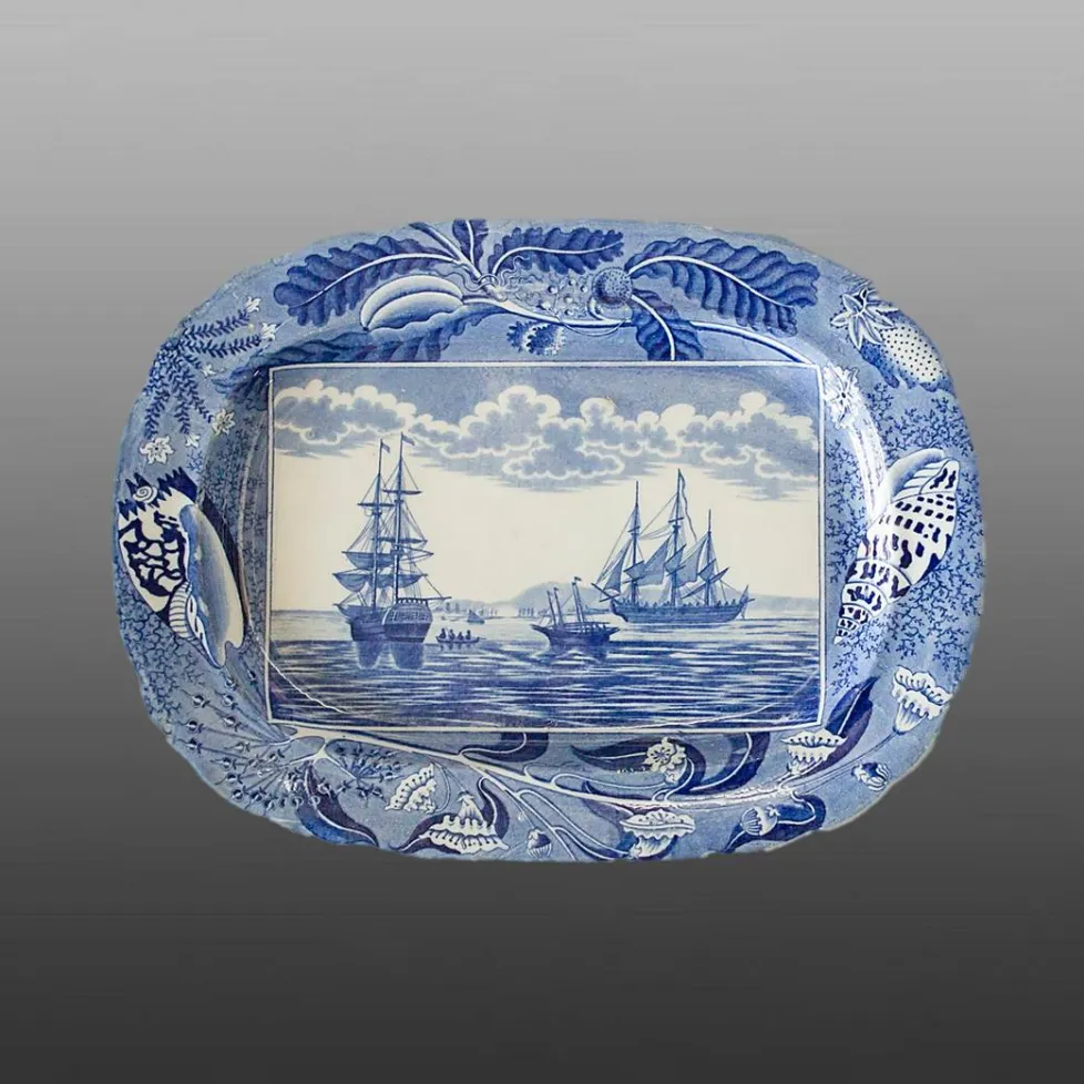 An earthenware platter printed in blue with a pattern named Harbour Scene II. The same pattern was printed on a pierced drainer also included in this exhibit.BACK TO CATALOG INDEX