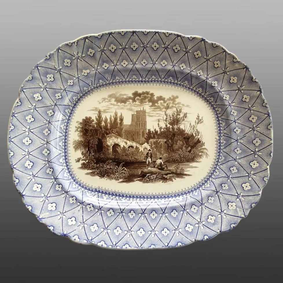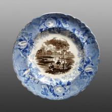 An additional example, a 7 inch earthenware dish with a different center view, is shown here with the Fish Bowl border also shown above. Color variations may be attributed to the photography, not the printing process.