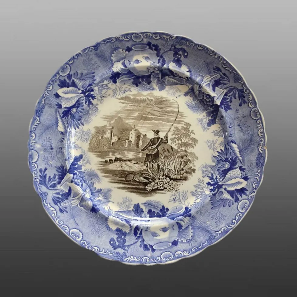 Shown here is a 10 inch scalloped dinner plate in another scene from the Fisherman Series that employs a different border design consisting of alternating groups of sea shells and fish in a bowl.