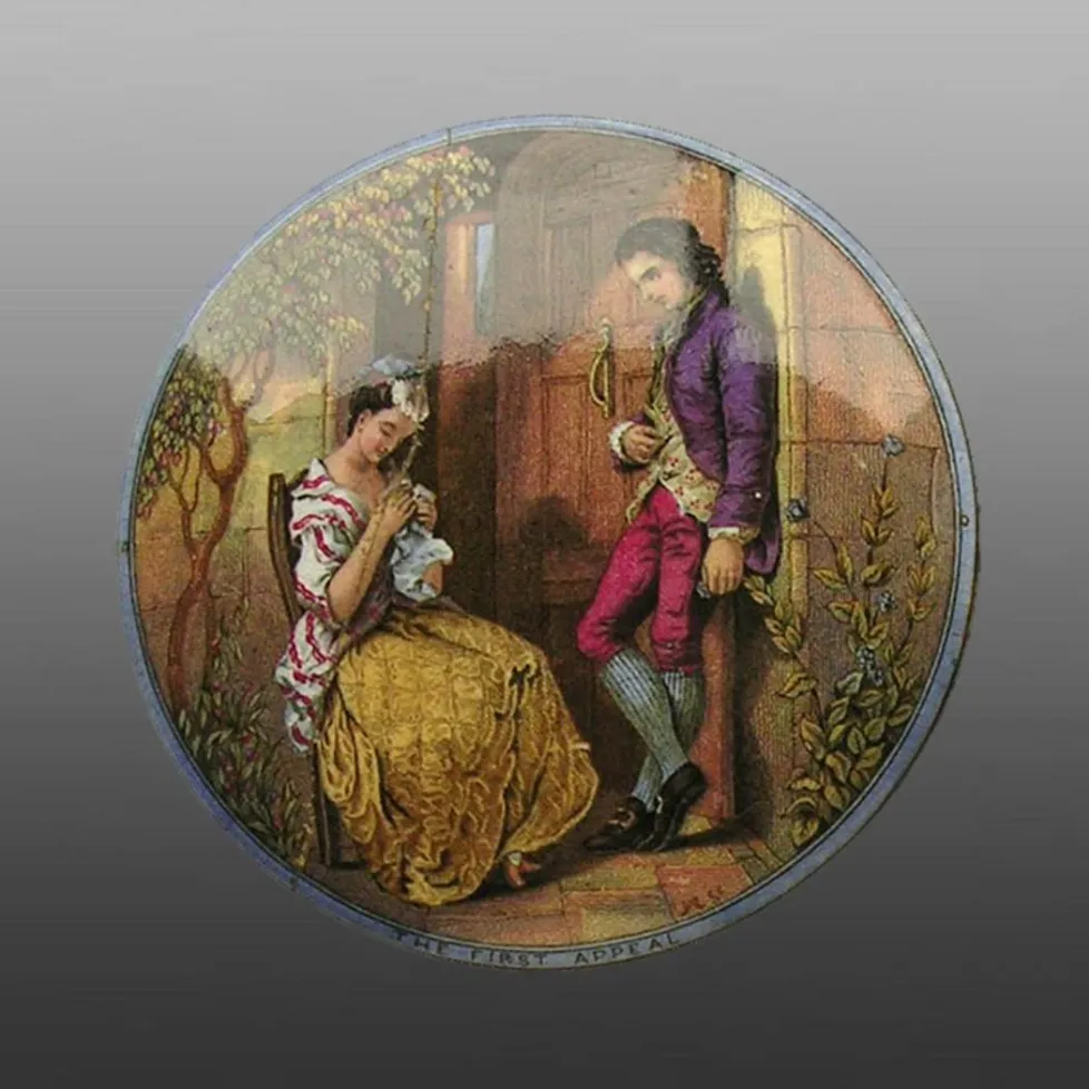 An earthenware pot lid multicolor printed with a genre scene  titled "The First Appeal" which is printed on the lid.  A good example of  multiple-plate multicolor printing by hot press.  The two registration dots used so that each plate could be lined up exactly on the dots printed by the previous plate can be seen at either side of the lid.  Although it cannot