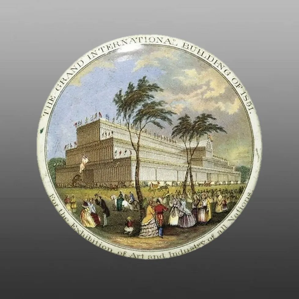Pot lid with design depicting the exterior of Crystal Palace and titled THE GRAND INTERNATIONAL BUILDING OF 1851. For the Exhibition of Art and Industry of All Nations.The multicolor printed lid was made for Crosse & Blackwell who registered meat pots of this kind as souvenir designs in October 1850.BACK TO CATALOG INDEX